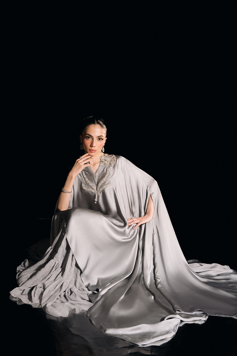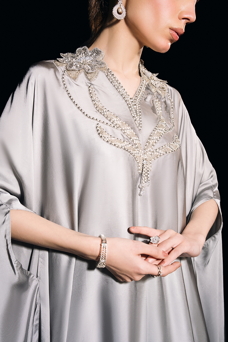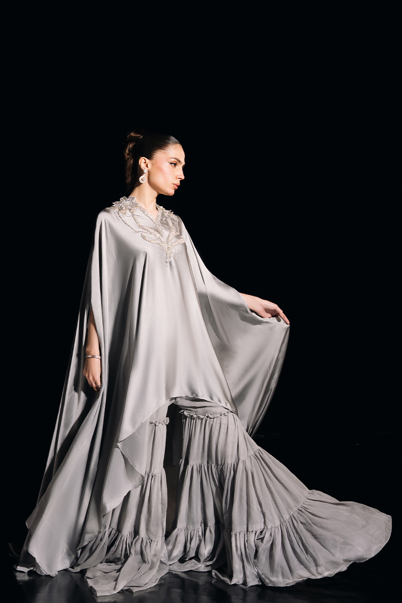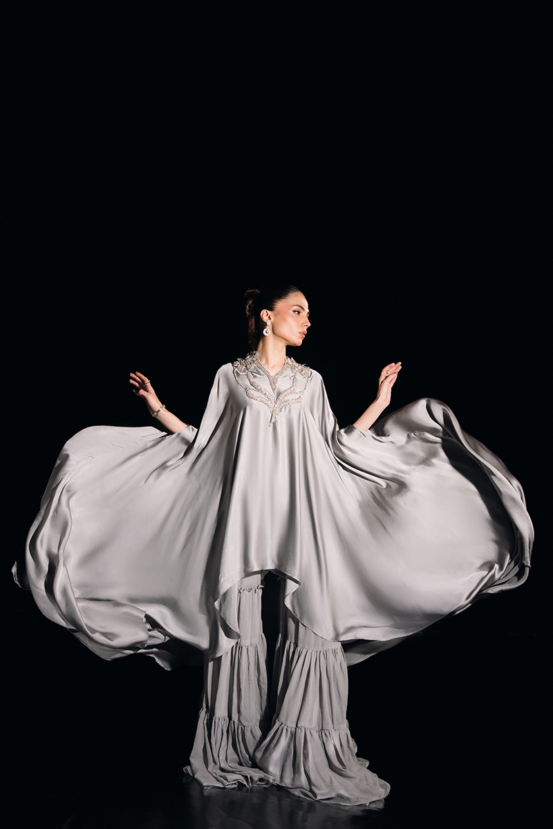 A flowy high-low kimono-inspired shirt paired with three-tiered flared sharara pants. The kimono features an exquisite hand-embellished neckline enhanced with Swarovski crystals, sequins, and pearls for a refined, statement finish.
