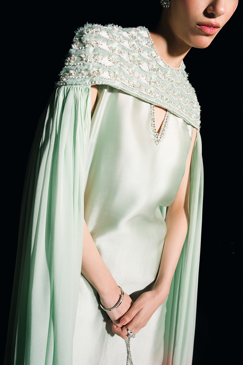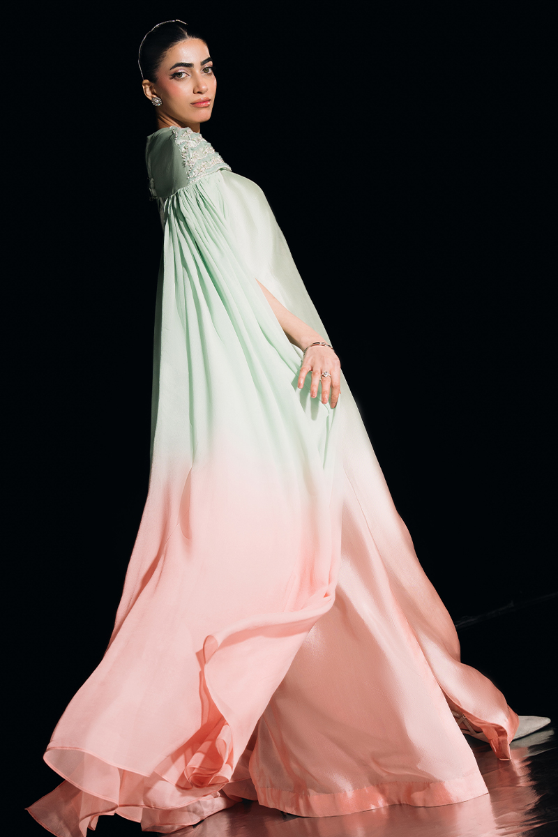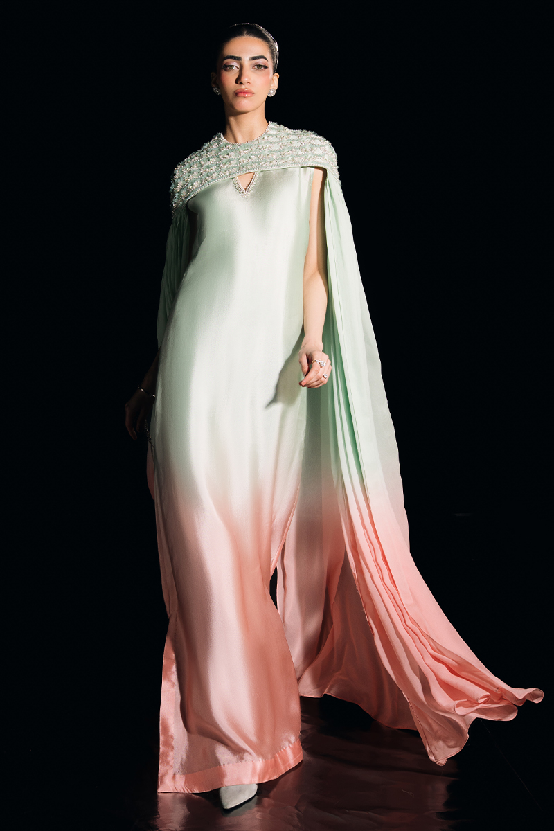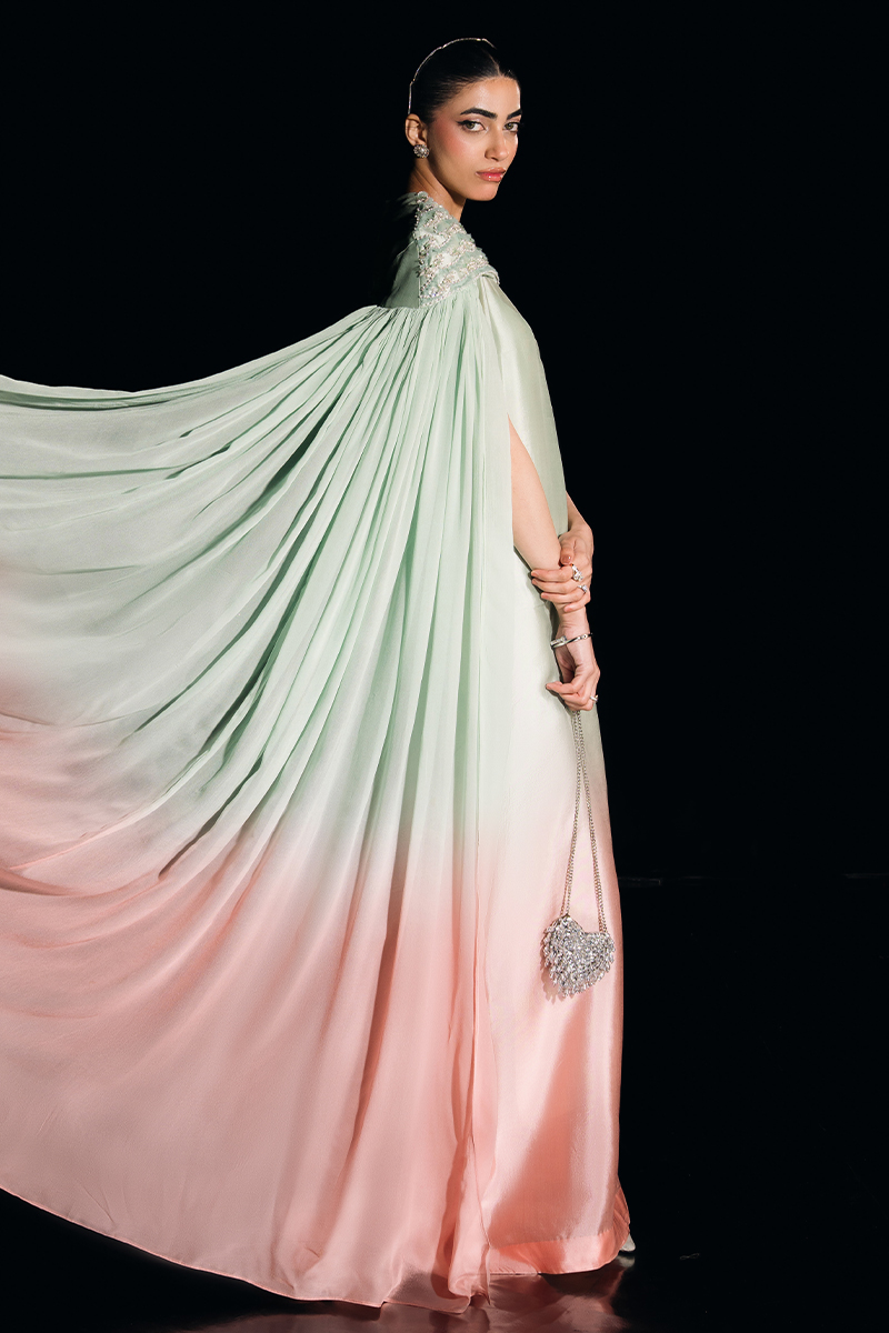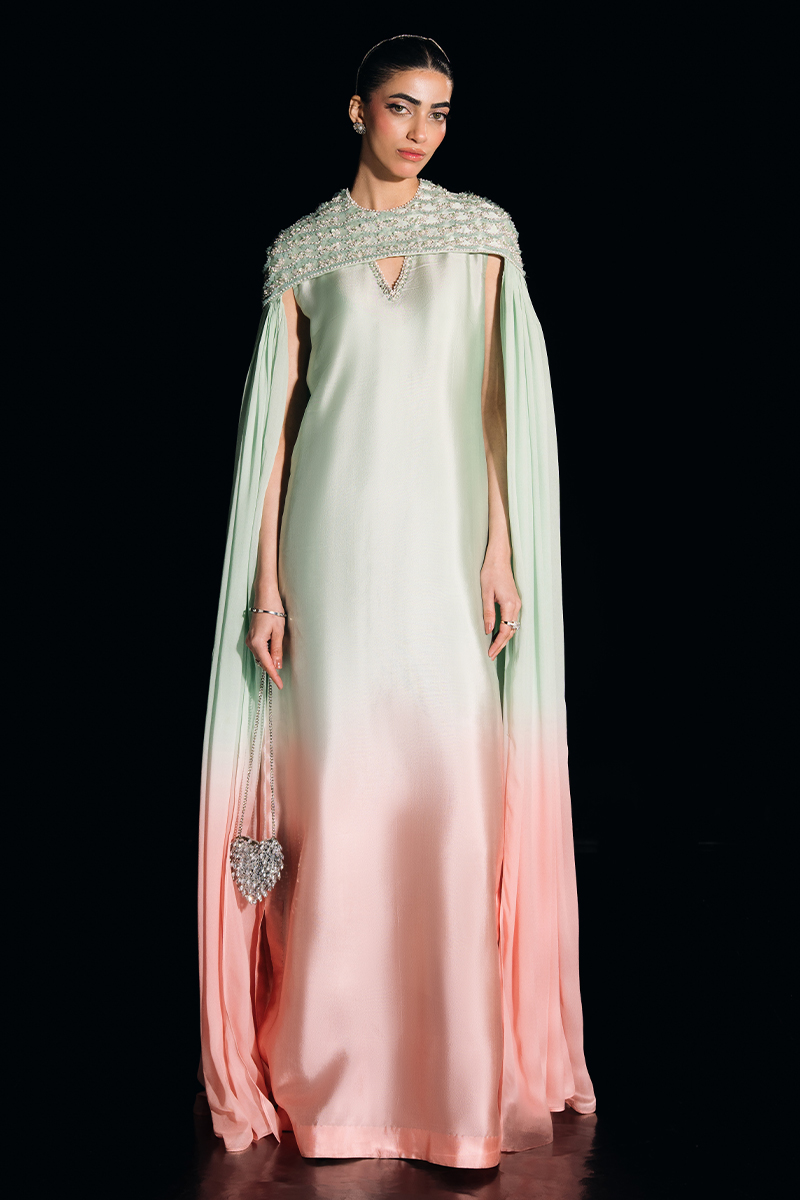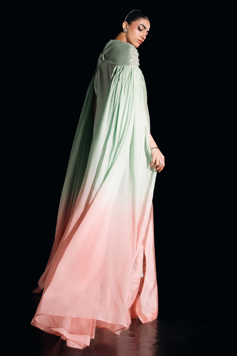 A floor-length sleeveless kaftan paired with a flowy cape in a soft ombré finish. The kaftan features a hand-embellished neckline, while the cape is adorned with intricate handwork, 3D net detailing, crystals, sequins, and pearls, elevated with a graceful ombré drape.