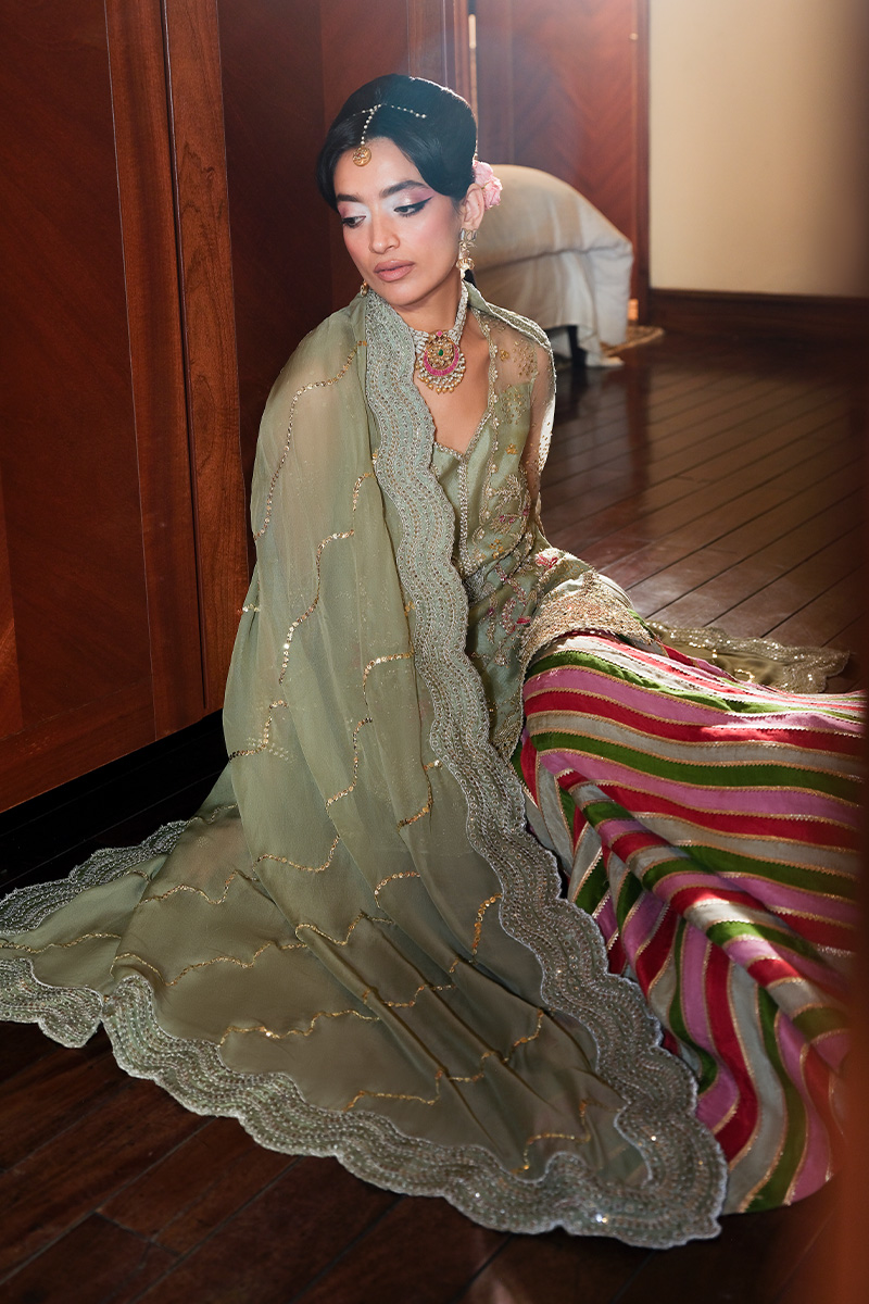Reshama - a timeless celebration of artistry, featuring a short-length organza shirt fully hand-embellished with intricate zardozi work, patchwork, and cutwork details. The design is elevated with net churidar sleeves delicately dusted with sequins, adding a graceful shimmer. Paired with a vibrant Thai silk gharara in multicolored chata pati style, finished with a can-can border for volume, this ensemble exudes festive elegance. A chiffon dupatta, adorned with scalloped sequin lines and a richly detailed border, completes the look, making Reshama the perfect balance of tradition and sophistication.