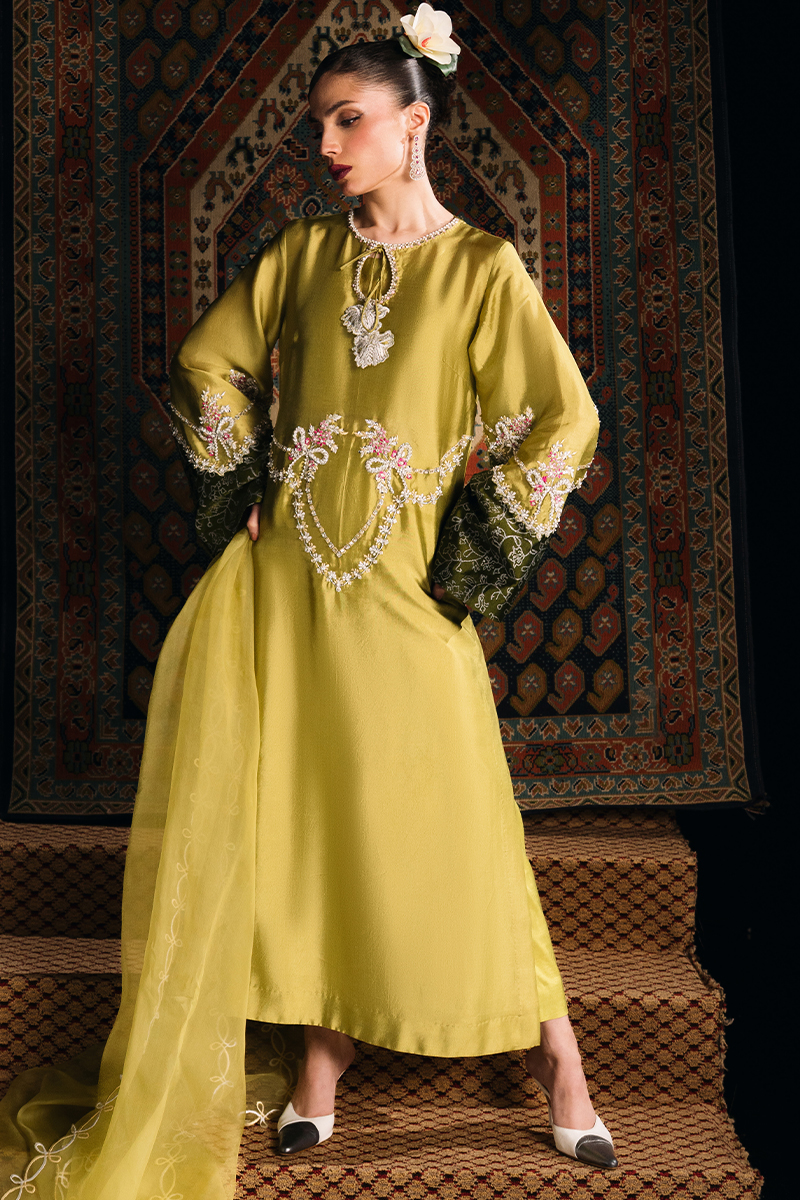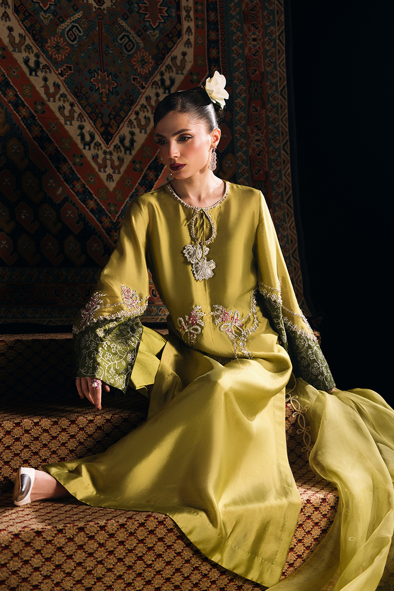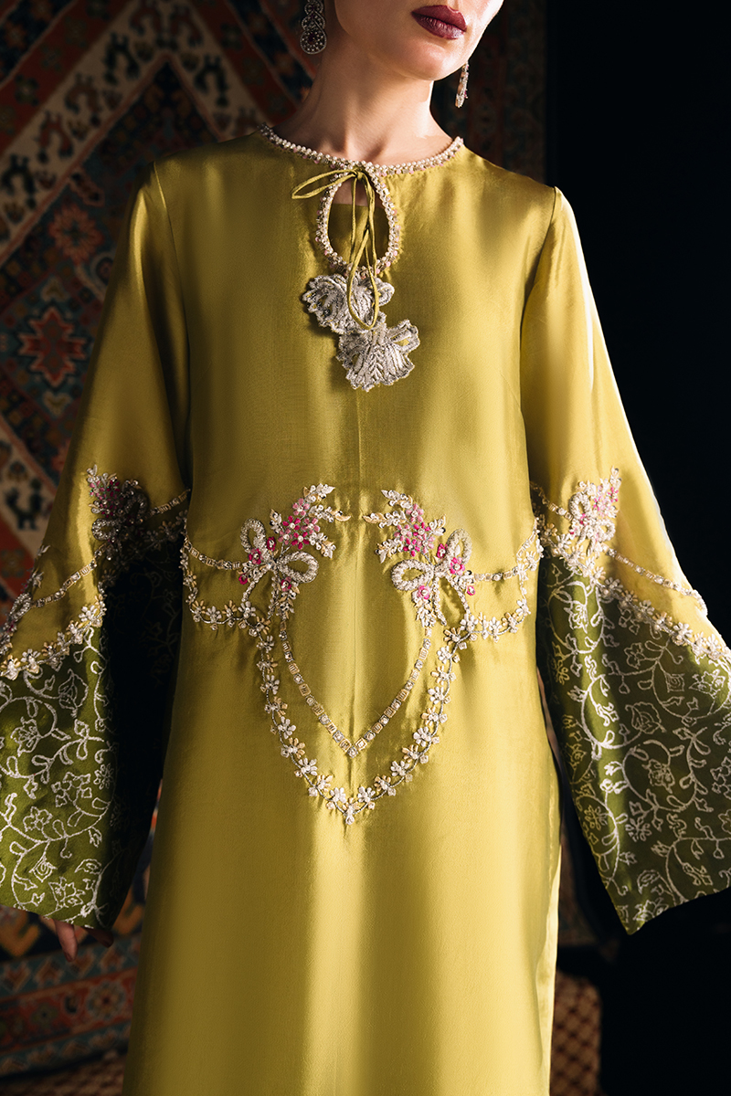 A long-length shirt paired with trousers and an organza dupatta. Adorned with hand-embroidered florals enhanced with crystals, sequins, and pearls, featuring an embellished round neckline with keyhole and tassel detailing, embroidered sleeves with contrast patchwork, and a dupatta finished with a scalloped embroidered border.