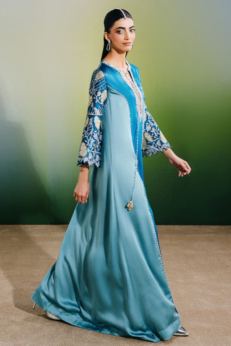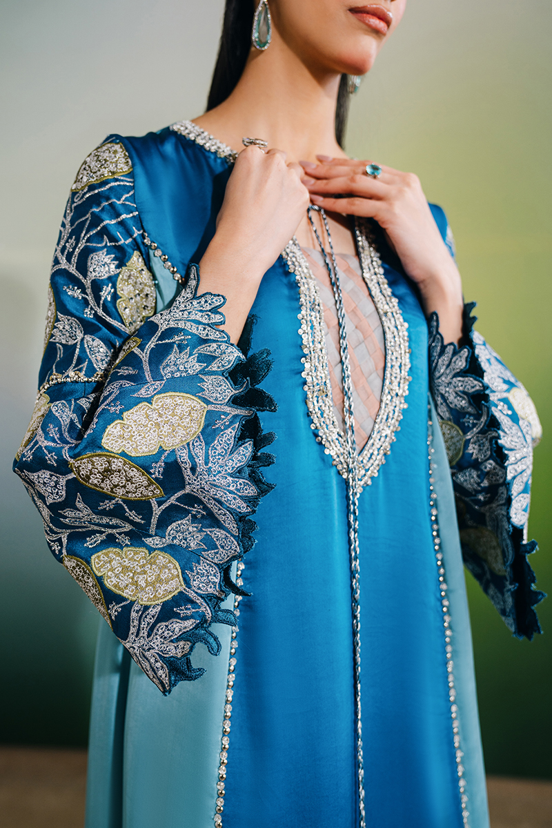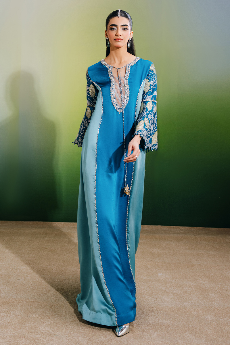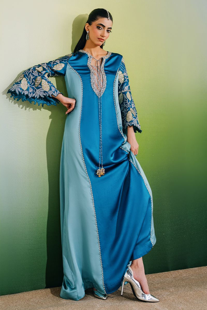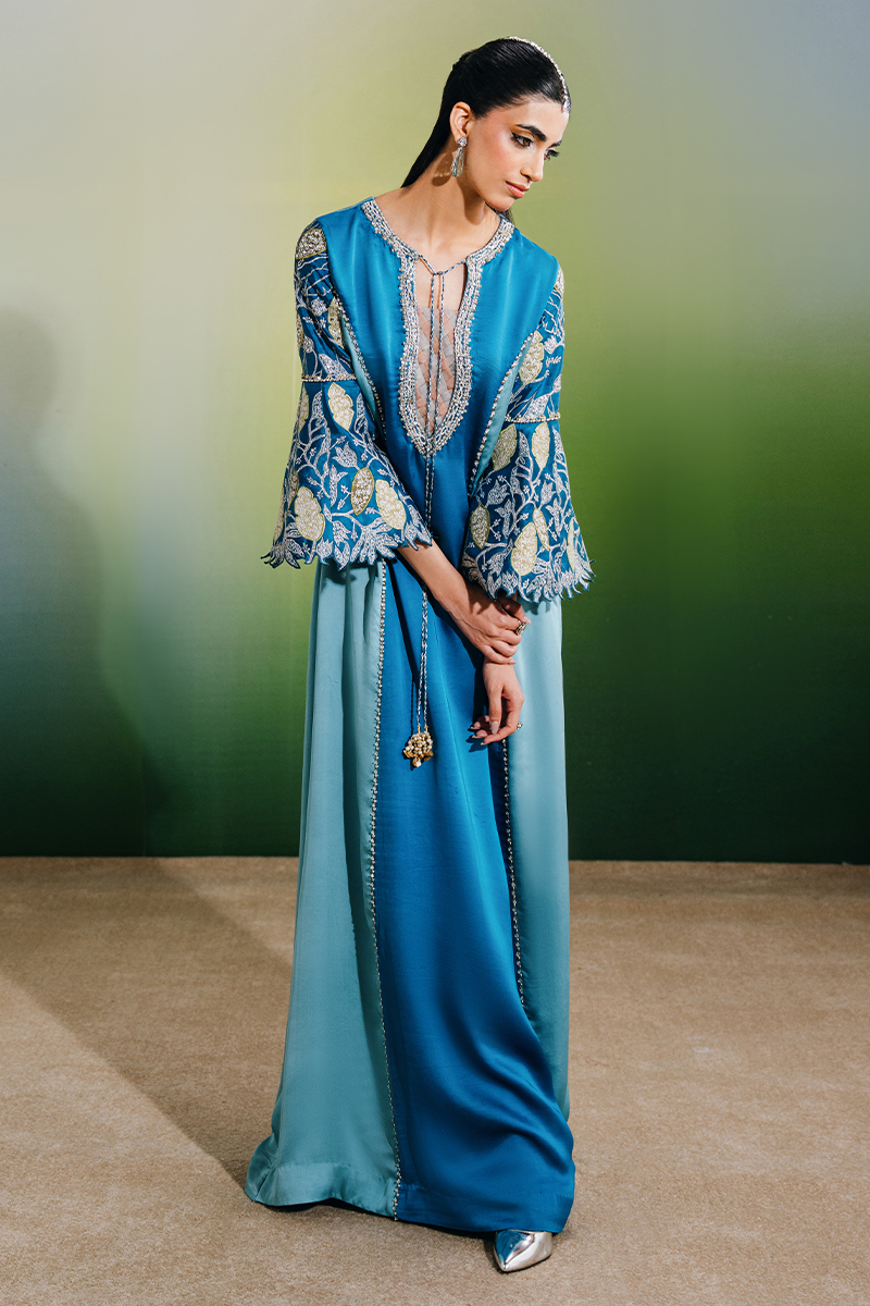 This two-tone kaftan-style dress features elegant color-blocked panels and a beautifully embellished neckline, adding a refined focal point to the silhouette. The sleeves are adorned with exquisite hand-embroidered florals, enhanced with hand-embellished borders, while delicate tassel detailing completes the look, bringing a subtle touch of movement and sophistication.