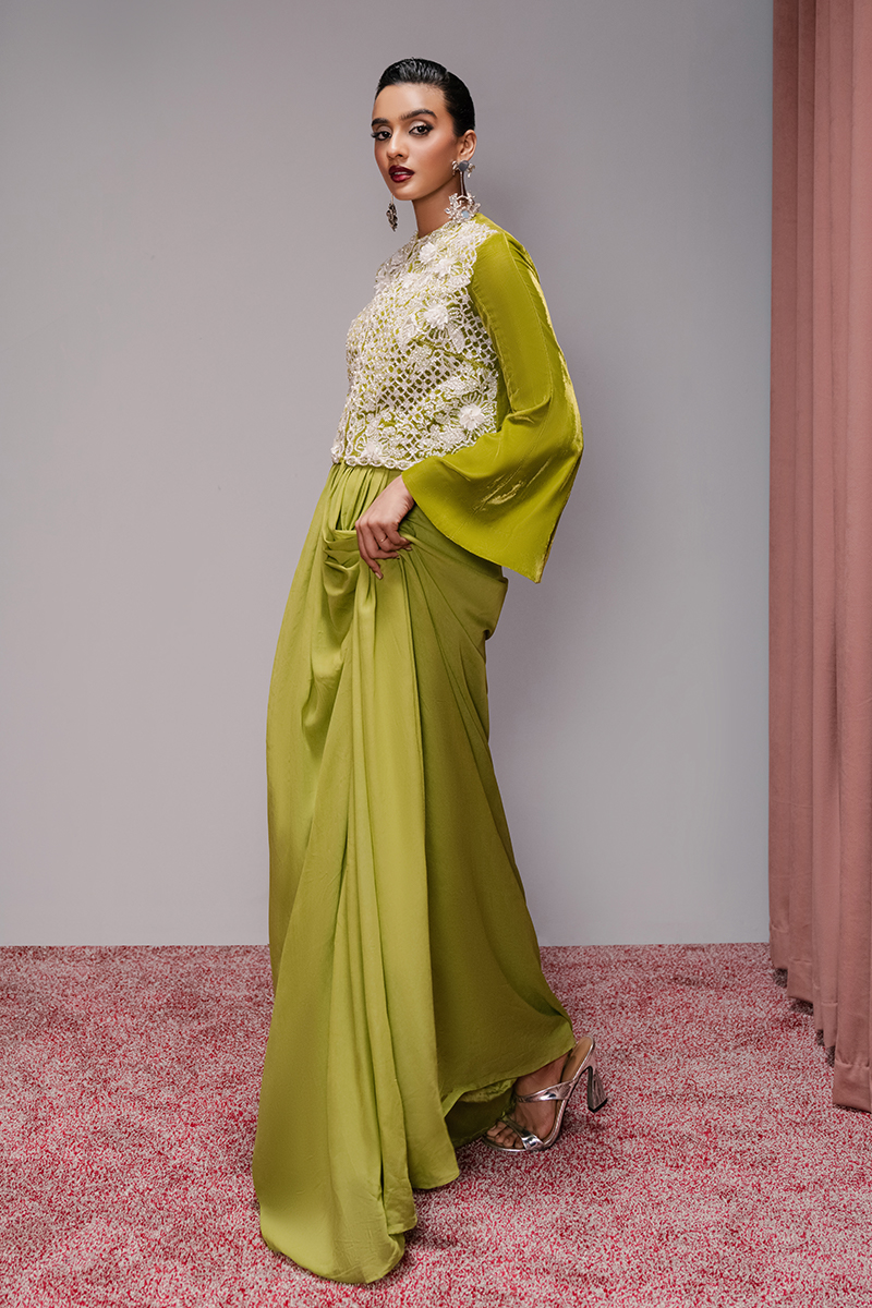 A captivating ensemble that brings together edgy elegance and contemporary flair. This set features a short velvet jacket in striking neon green, beautifully adorned with intricate all-white embroidery, shimmering beadwork, and accents of pearls, sequins, and crystals for a truly radiant finish. Paired with a softly draped chiffon skirt, the outfit flows gracefully, adding movement and charm.