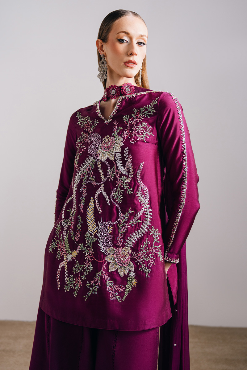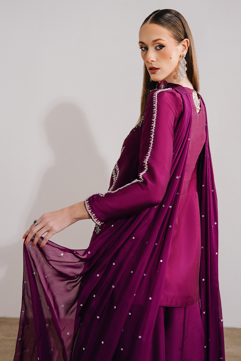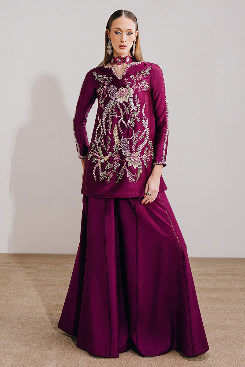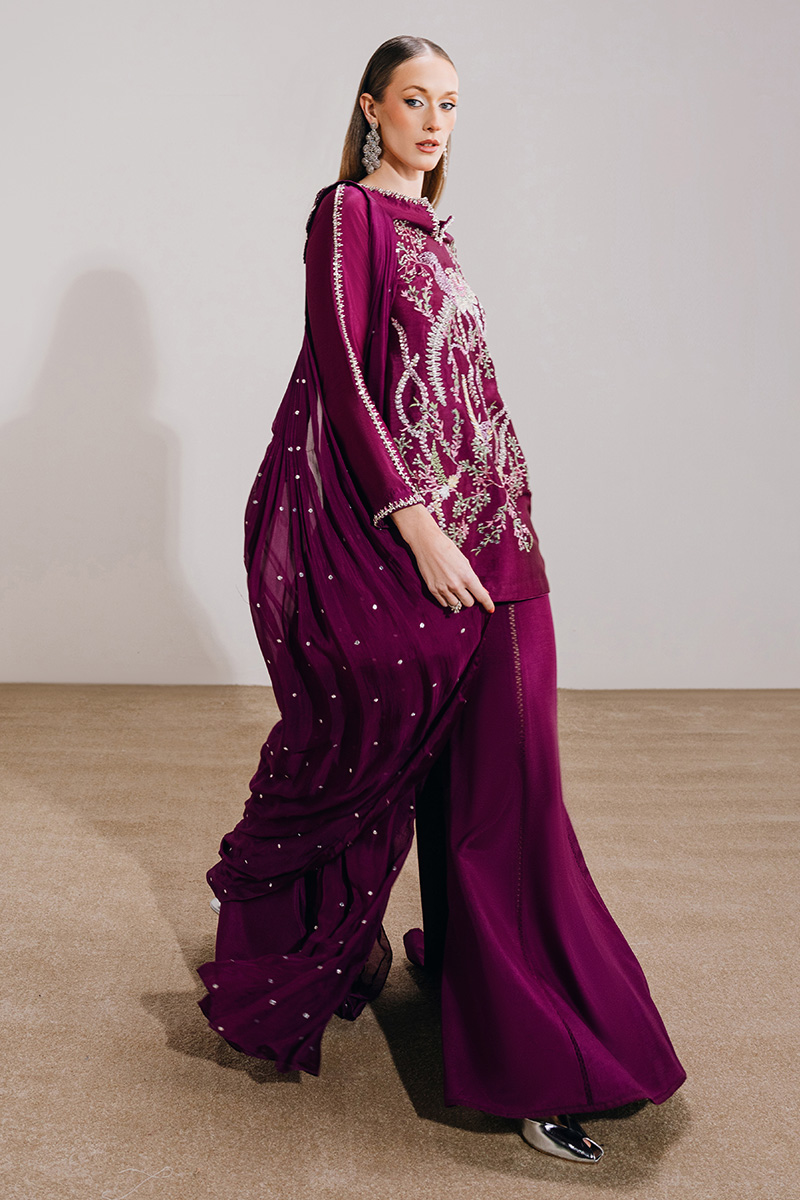 This light plum ensemble features a mid-thigh shirt paired with a sharara and a medium silk dupatta, offering a refined yet graceful silhouette. The shirt is adorned with exquisite hand-embroidered florals, elevated with hand-embellished borders on the neckline and sleeves and enhanced with crystals, sequins, and pearls for a subtle shimmer. A delicate keyhole detail at the back neckline, finished with embellished tassels, adds a thoughtful touch, while the sharara is detailed with lace inserts for added movement. The look is completed with a medium silk dupatta, highlighted with three-dimensional florals and pleat detailing, bringing depth and elegance to the ensemble.