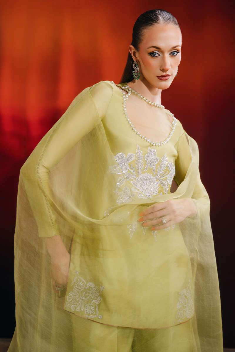 This lemon yellow ensemble features a mid-thigh short shirt paired with an ombré culotte and a sheer organza dupatta, creating a fresh yet refined silhouette. The shirt is adorned with exquisite hand-embroidered florals, delicately embellished with dabka, crystals, sequins, and pearls, and finished with an organza neckline featuring cut-out detailing highlighted by hand-embellished borders. Lace inserts on the sleeves add softness, while the ombré culotte is elevated with intricate embroidered detailing for graceful movement. The look is completed with an organza dupatta, beautifully accented with embellished florals and detailed corners for an elevated finish.