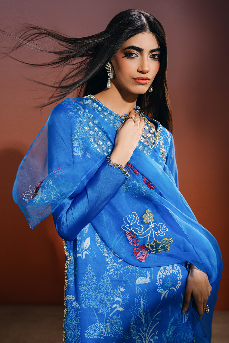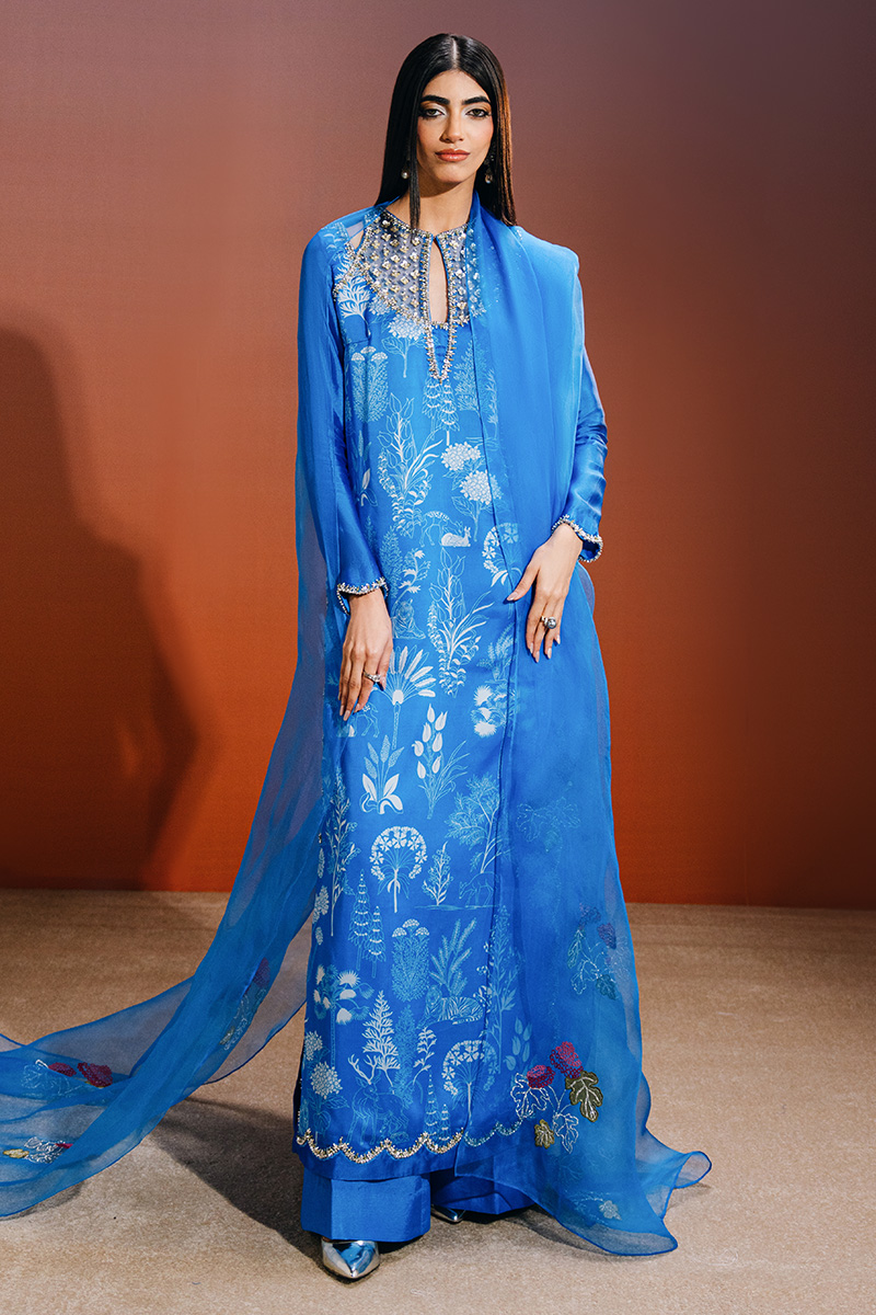 This “IT Girl” cobalt blue ensemble features a printed shirt paired with flared pants and a sheer organza dupatta for a striking, contemporary silhouette. The shirt is elevated with an exquisite hand-embellished neckline, adorned with crystals, sequins, and pearls, while solid scalloped borders with embellished edging grace the sides and hem. The sleeves are finished with a hand-embellished scalloped border, and the organza dupatta is beautifully highlighted with colorful embroidered motifs enhanced with delicate patchwork, completing a look that’s modern, chic, and effortlessly statement-making.