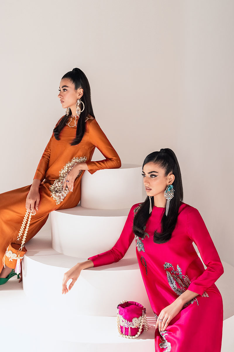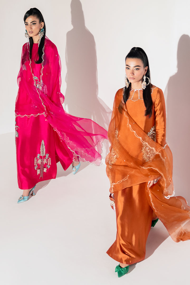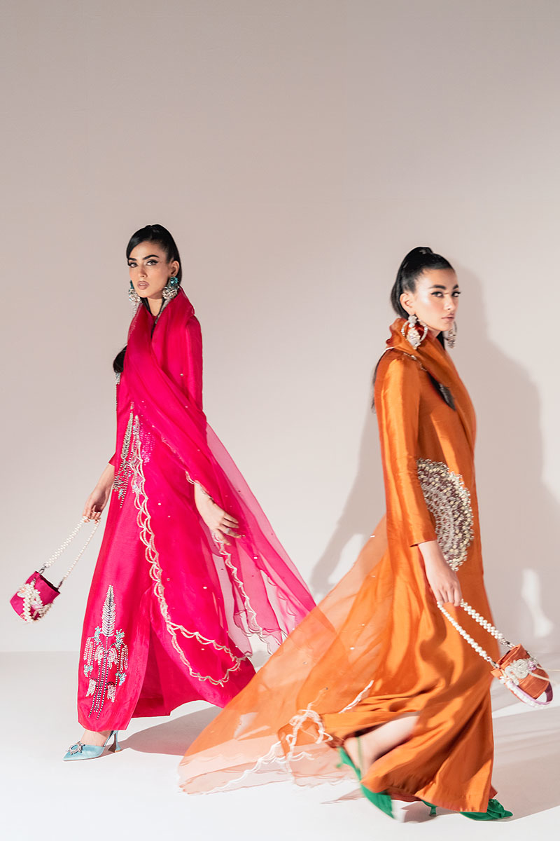 The bold and vibrant hawt pink long Kaftaan dress in tissue silk fabric is a true statement piece. Crafted with intricate silver embellishment on black thread, this ensemble is designed to make you look feminine and glamorous. The hawt pink matching organza scalloped dupatta perfectly complements the outfit.