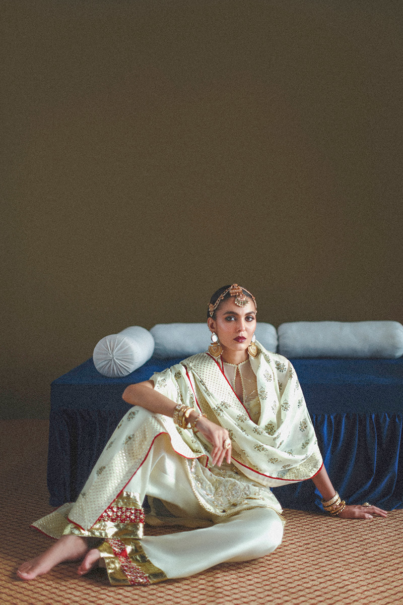 Mahrani - A celebration of timeless femininity, featuring a sleeveless round neck shirt adorned with exquisite hand-embroidered jaal, enhanced with dabka, nakshi, sequins, pearls, crystals, and delicate thread work. Lace inserts run throughout the design, adding texture and softness. It is paired with a flared trouser finished with a hand-embellished border and lappa inserts for a regal touch. The look is completed with a printed medium silk dupatta, bordered with contrast piping for a refined finish. Exquisite tassel detailing at the back neckline brings an element of graceful movement to this poised and elegant ensemble.
