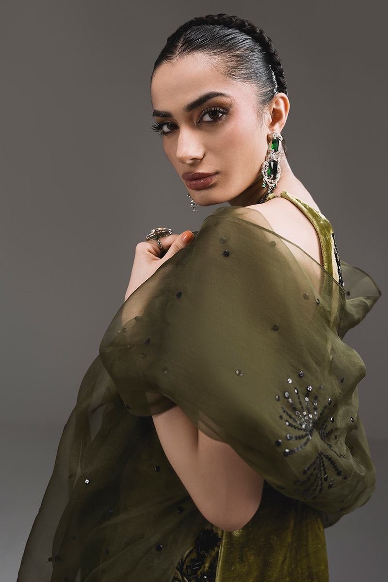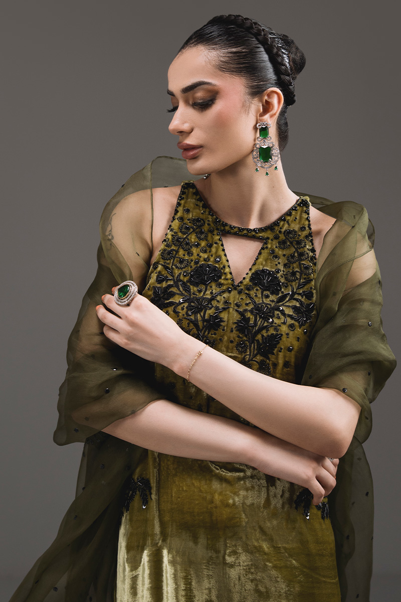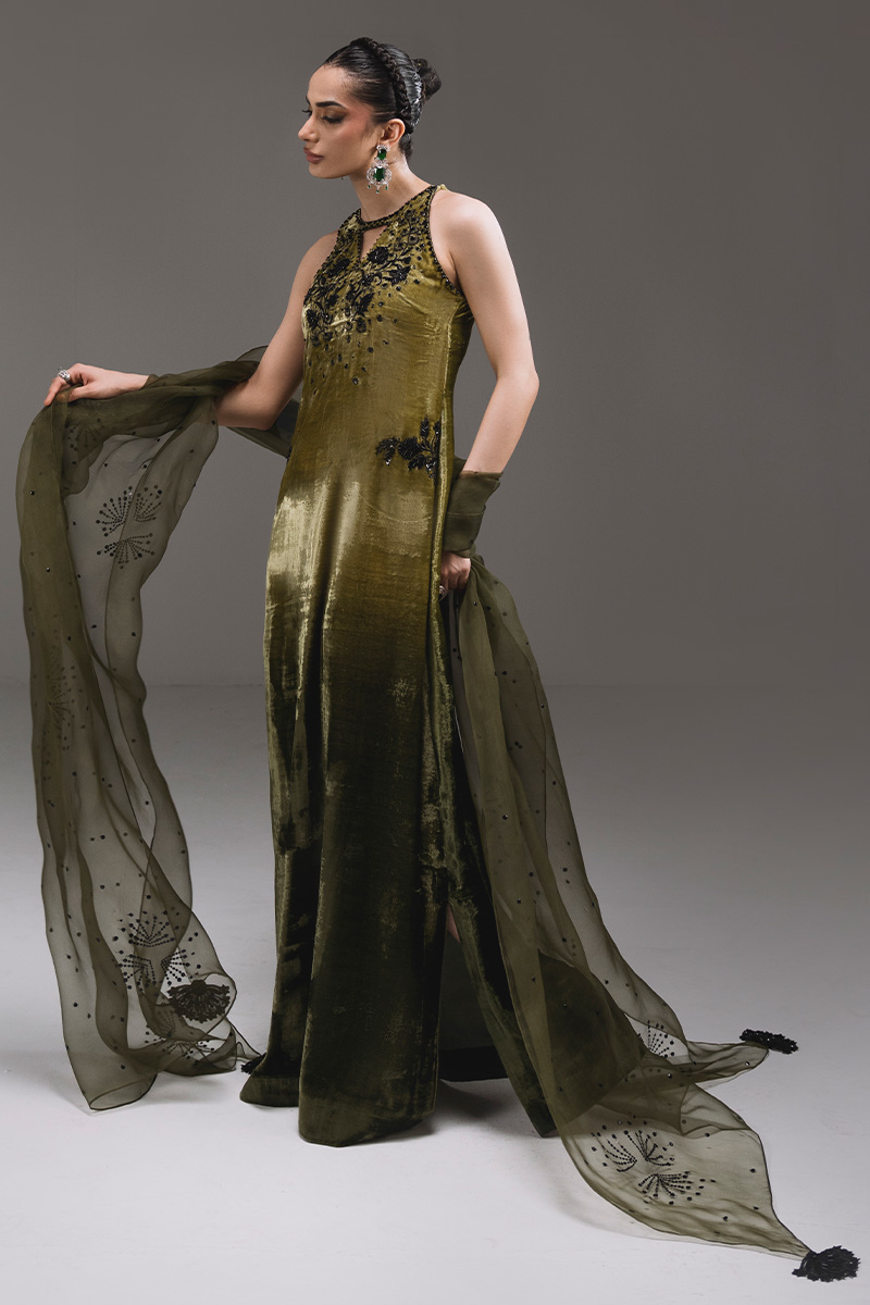 A striking halter-neck kaftan adorned with intricate embroidery and hand-embellished motifs, elevated by a soft ombré finish. The delicate front keyhole and statement embellished back motif add modern elegance to the flowing silhouette. Paired with an organza dupatta featuring shimmering sequin accents and tassel detailing for a graceful, festive finish.