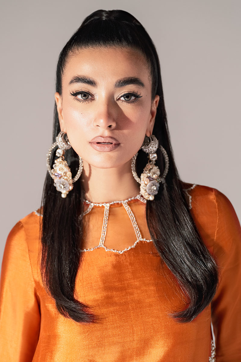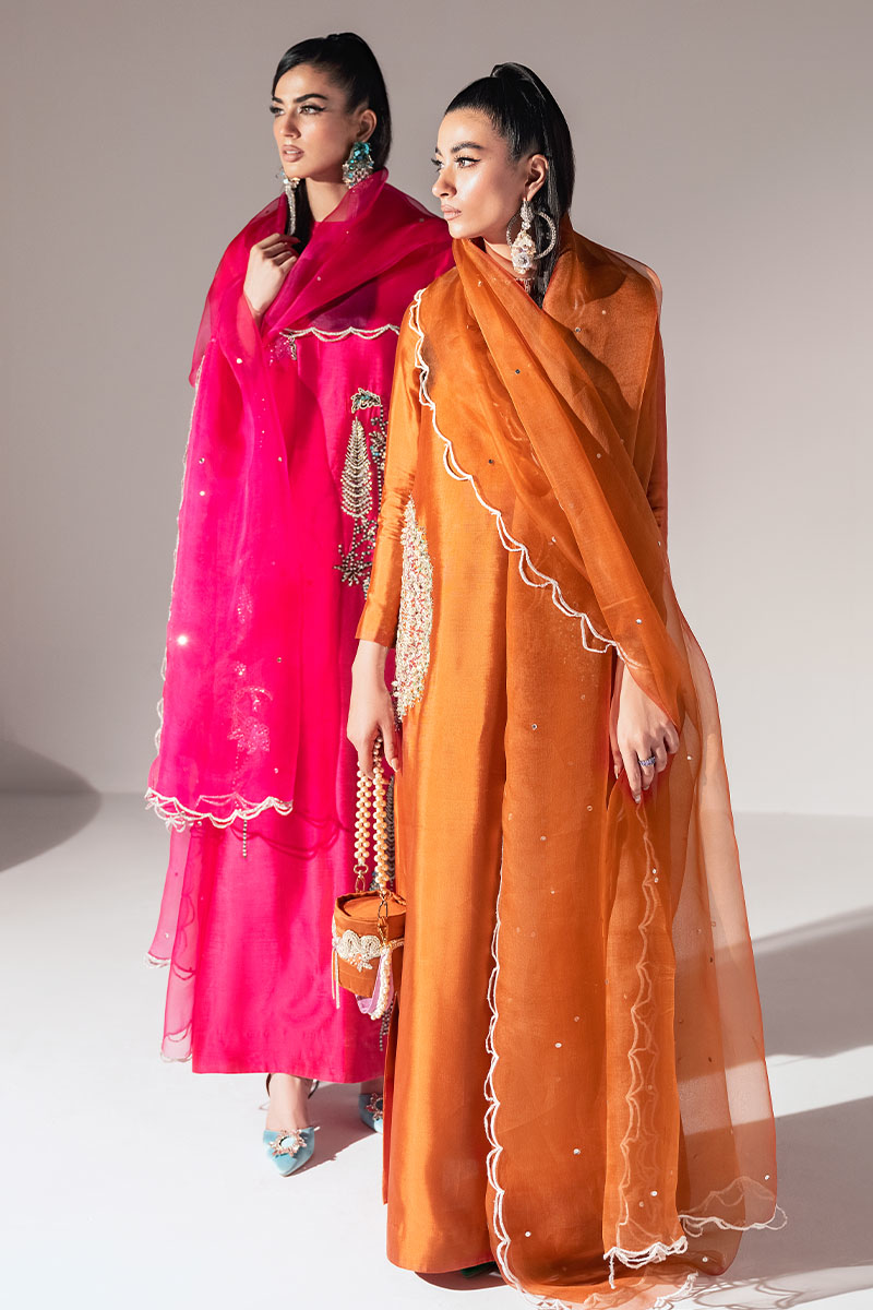 Crafted from the finest quality fabric, this rust orange long and chic Kaftaan shirt with short side slits is a true masterpiece. The silver embellishments add a touch of luxury to the outfit; it has two heavily embellished motifs on the sides with the modern detailed neckline. Perfected with the organza dupatta with a white border adds a touch of sophistication.