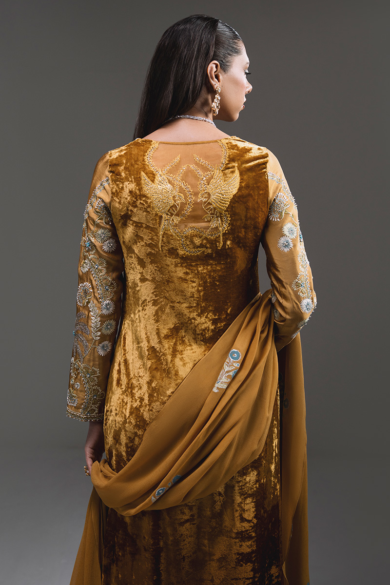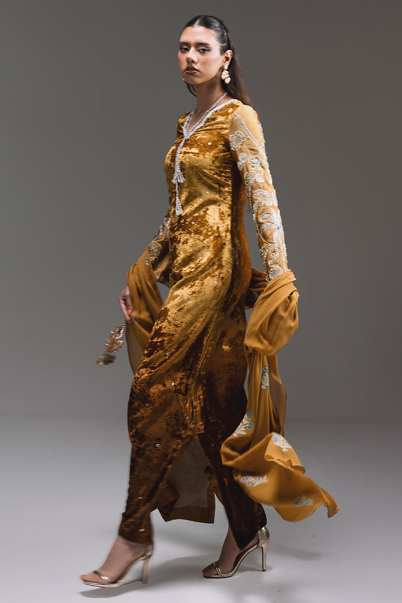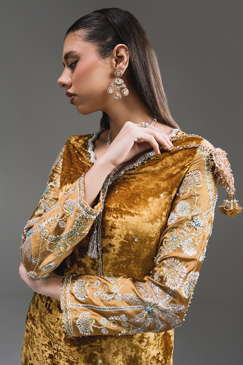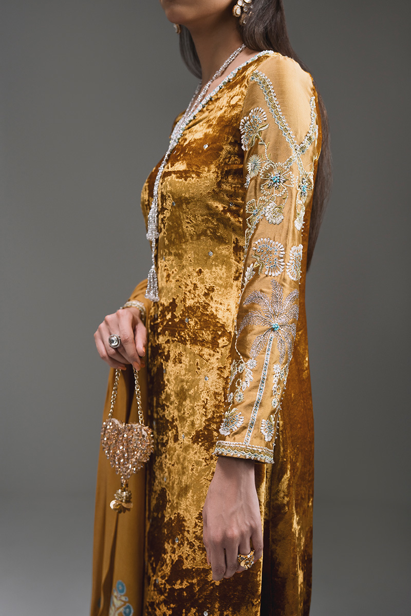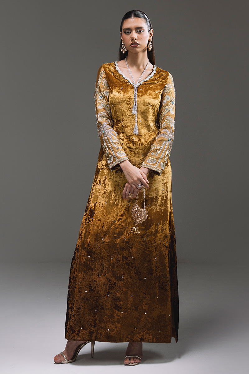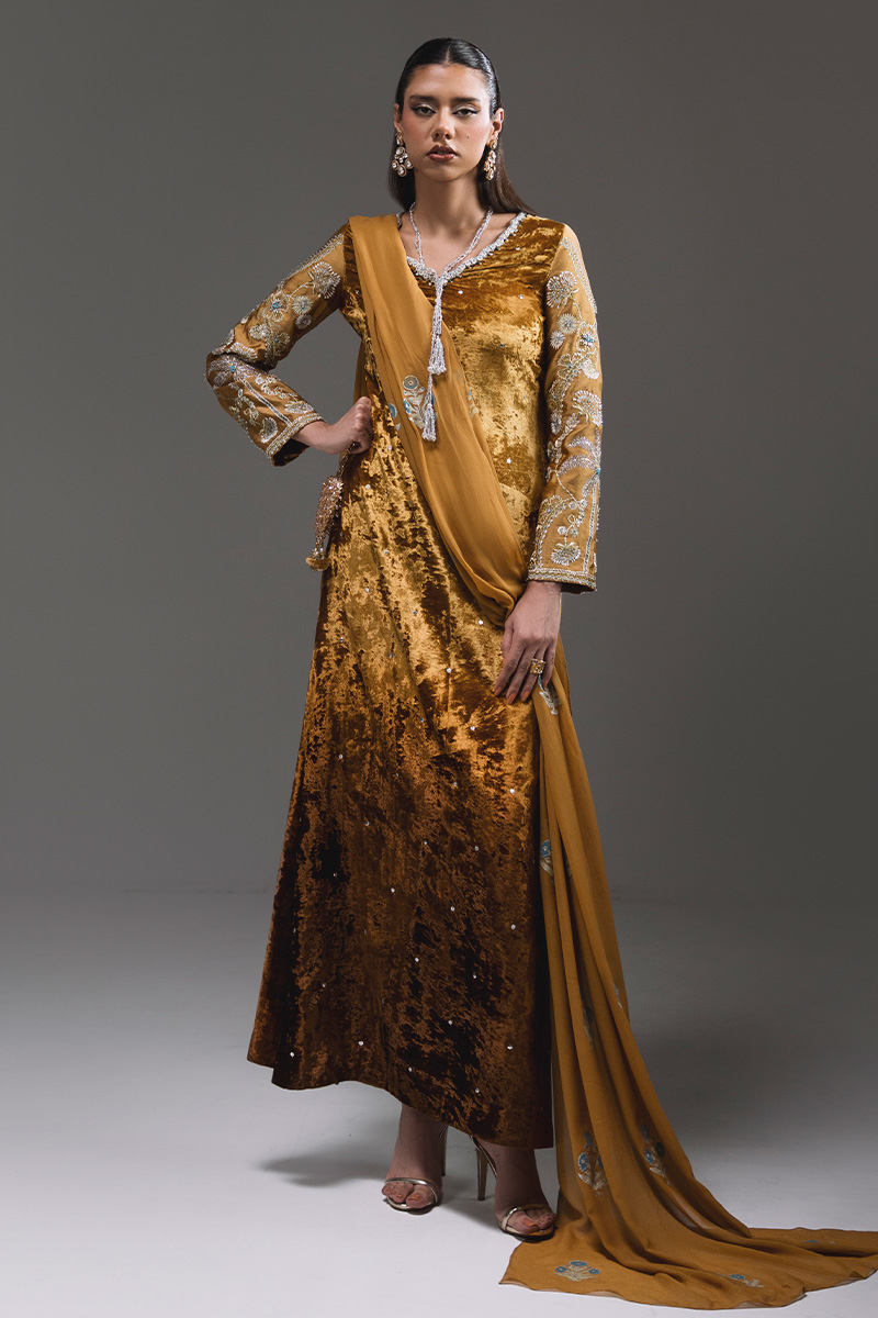 A luxurious V-neck kaftan dress featuring intricate embroidery, hand embellishments, and soft ombré shading for a modern ethereal look. The embellished tassel and scalloped neckline with sequin sprinkles elevate its elegance, while the sleeves showcase detailed motifs. Paired with a chiffon dupatta beautifully adorned with colorful block-printed motifs for a chic, artistic flair.