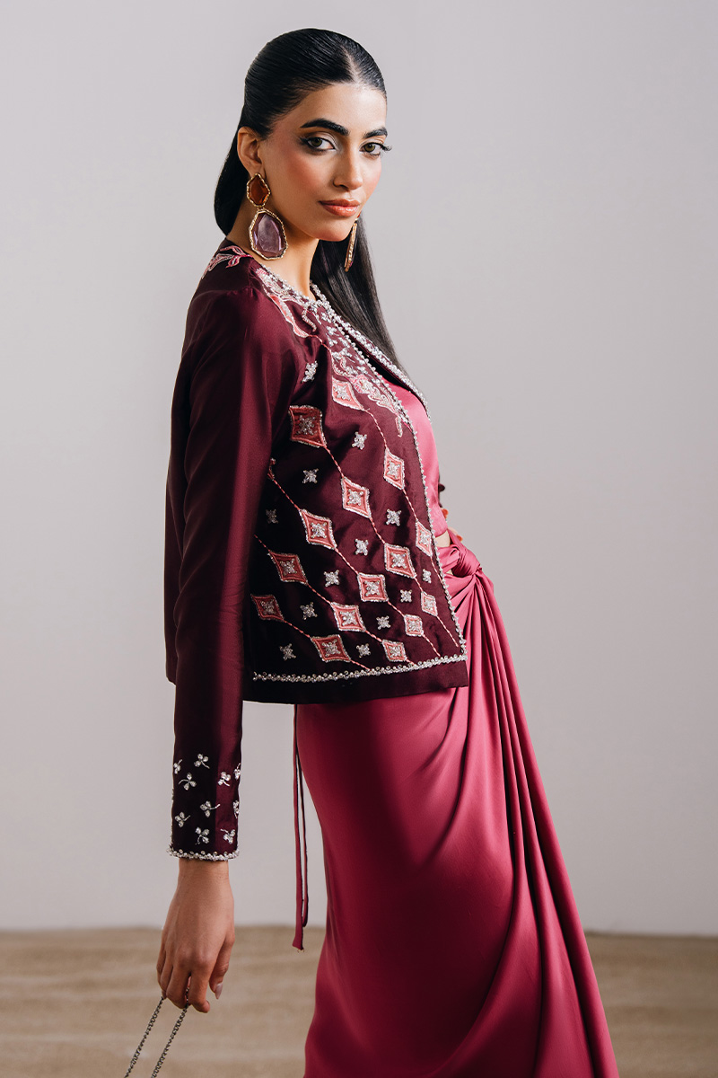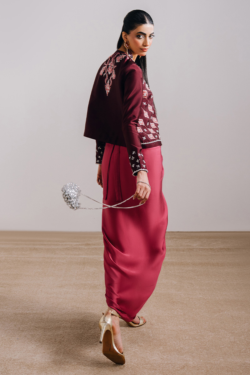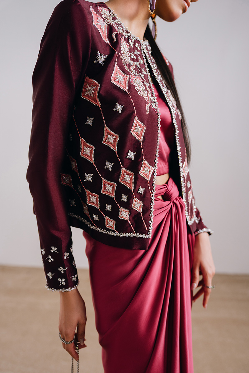 This maroon ensemble features a round-neck, front-open jacket paired with a flowing skirt, creating an elegant and contemporary silhouette. The jacket is adorned with exquisite hand-embroidered and embellished florals, complemented by embroidered and embellished sleeve detailing for a refined finish. It is paired with a flowy wrap-around chiffon skirt, adding graceful movement and completing the look with effortless sophistication.