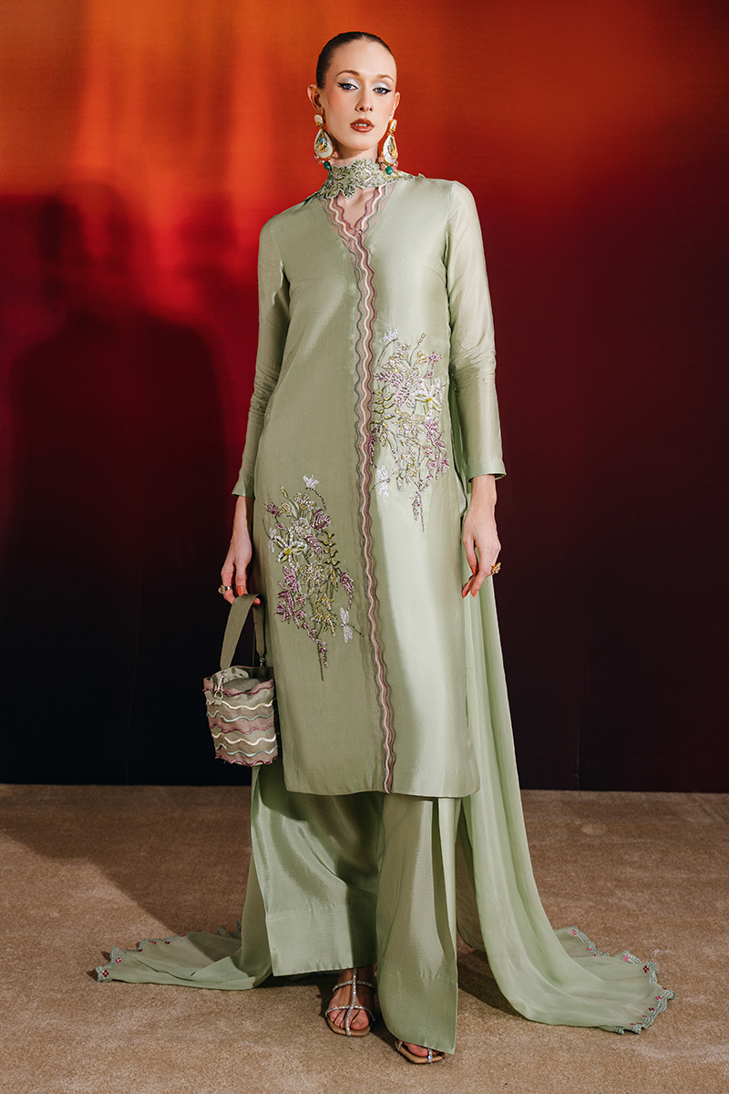 This mint ensemble features a knee-length shirt paired with a farshi shalwar and an embroidered chiffon dupatta, creating a graceful and elevated silhouette. The shirt is adorned with exquisite hand-embellished florals, enhanced with crystals, sequins, and kut dana, and finished with embroidered scalloped borders on the front for added detail. The farshi shalwar adds volume and movement, while the chiffon dupatta, detailed with an embroidered border and pleat accents, completes the look with refined elegance.