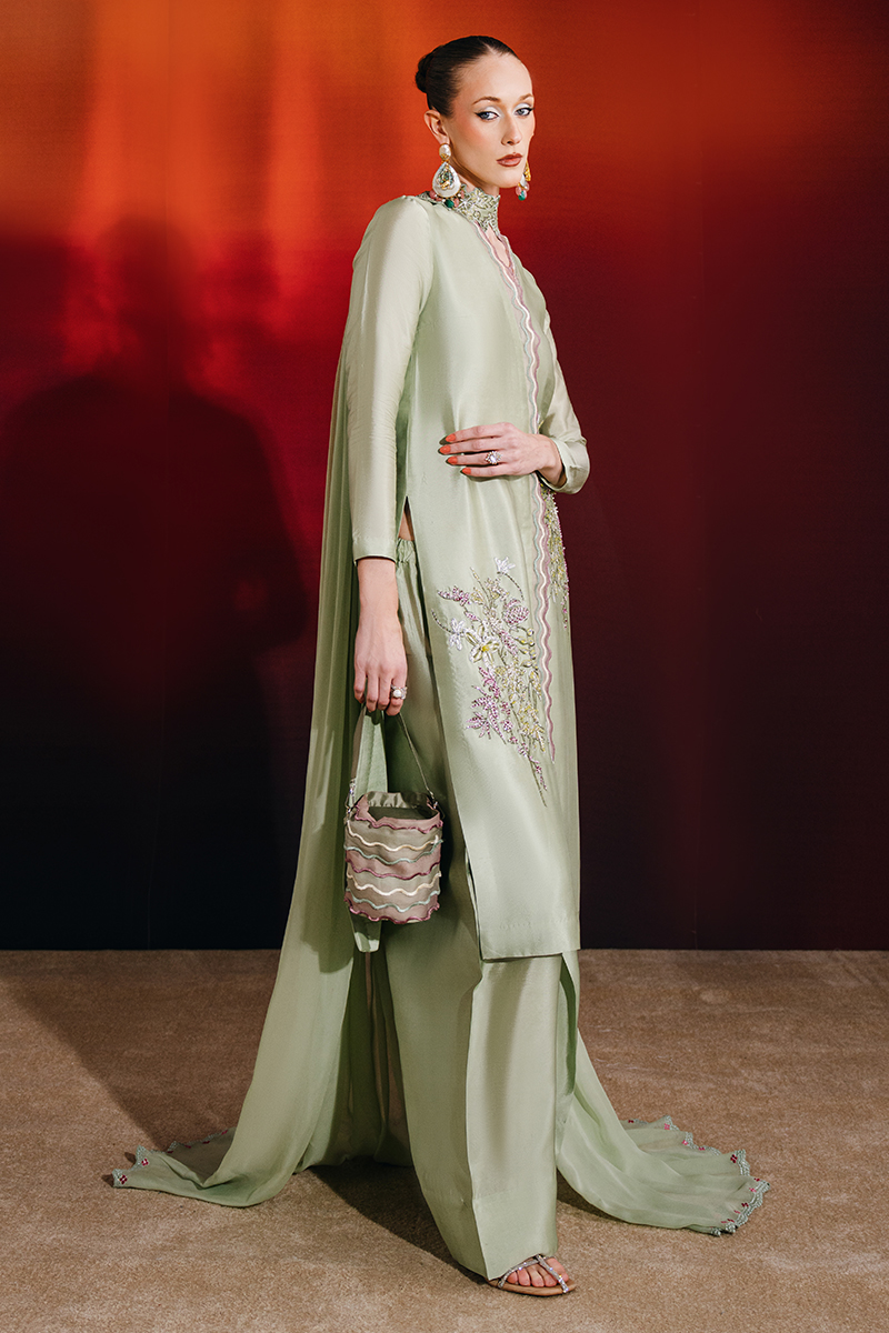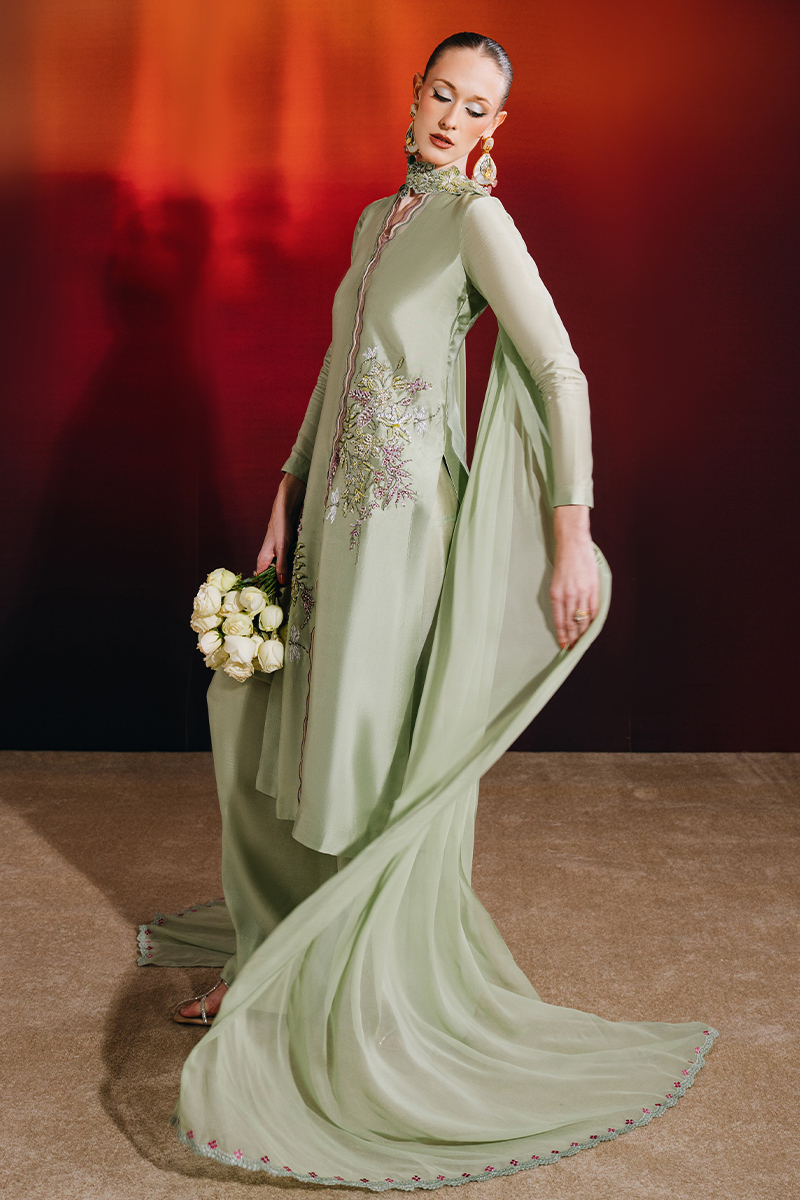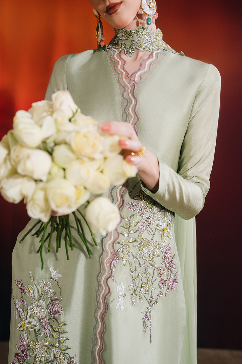 This mint ensemble features a knee-length shirt paired with a farshi shalwar and an embroidered chiffon dupatta, creating a graceful and elevated silhouette. The shirt is adorned with exquisite hand-embellished florals, enhanced with crystals, sequins, and kut dana, and finished with embroidered scalloped borders on the front for added detail. The farshi shalwar adds volume and movement, while the chiffon dupatta, detailed with an embroidered border and pleat accents, completes the look with refined elegance.