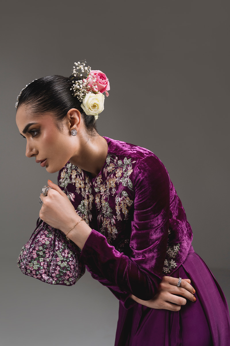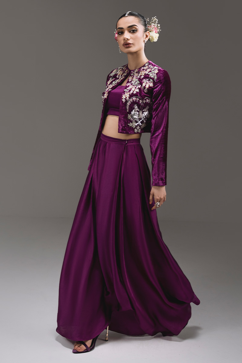 A chic round-neck, front-open jacket adorned with delicate embroidery and embellishments, radiating modern elegance. Paired with a soft, box-pleated skirt that drapes beautifully, this ensemble blends structure with graceful movement. A sophisticated look perfect for contemporary festive charm.