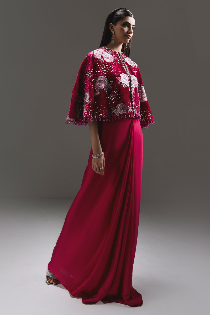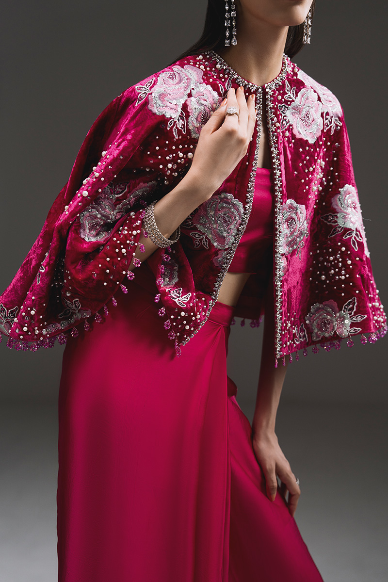 An ethereal front-open cape showcasing floral embroidery, embellished borders, and a soft sequin spray for subtle sparkle. The scalloped embellished lace hem enhances its feminine charm. Styled with a rich Chimosé silk bustier and a pleated skirt, the look offers effortless sophistication with contemporary flair.