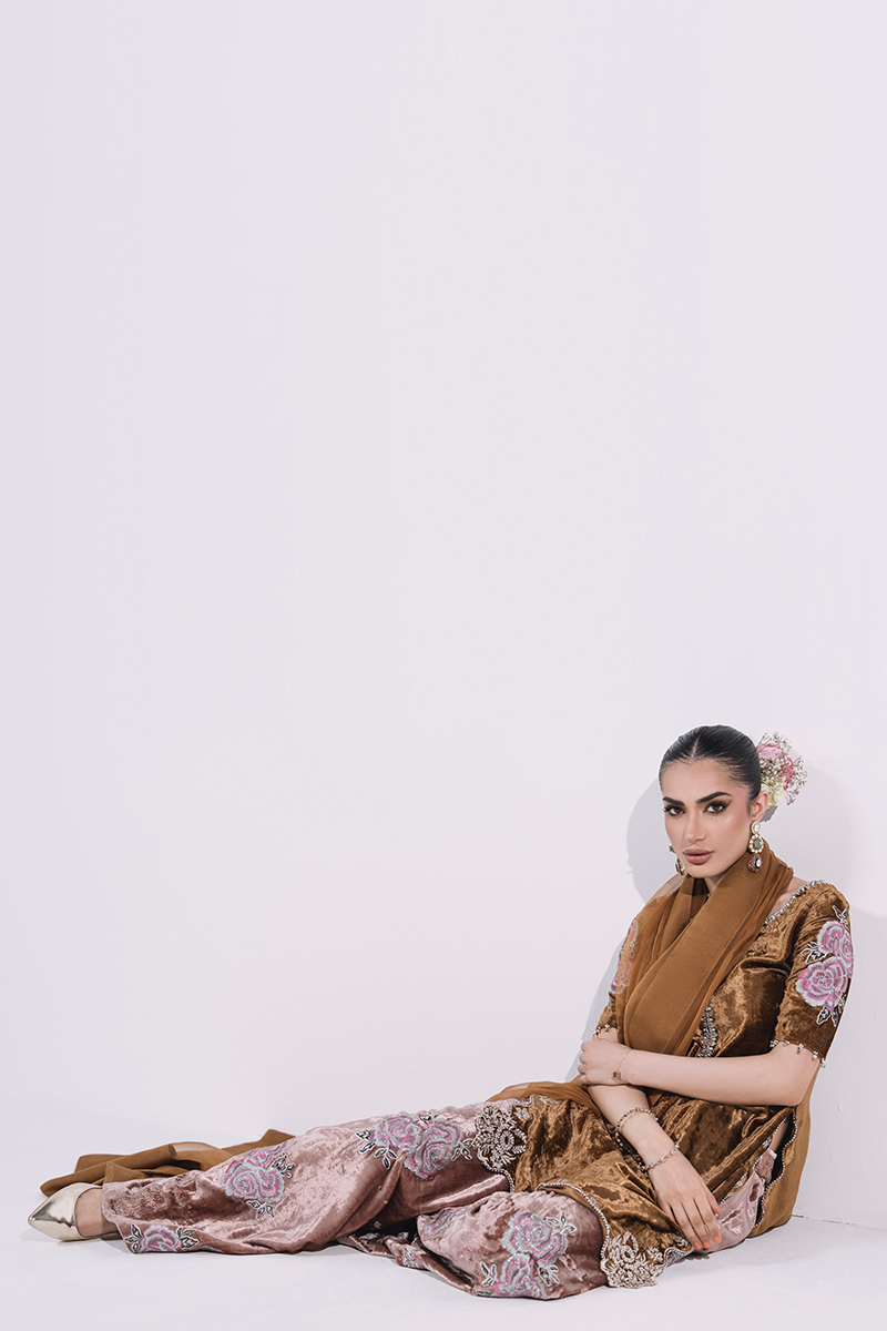 A chic boat-neck mid-thigh shirt featuring half sleeves, adorned with embroidered scalloped daaman and delicate floral sleeve motifs, enhanced by an embellished neckline for refined sparkle. Paired with contrast flared-fit velvet trousers showcasing embroidered florals on the front and back for a luxe touch. Completed with an organza dupatta finished with graceful borders, offering a perfect balance of sophistication and contemporary charm.