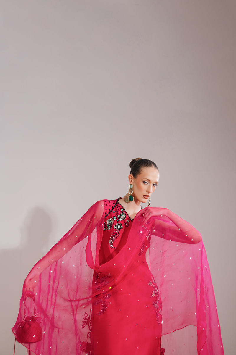 This shocking pink ensemble features a sleeveless kaftan-style dress paired with a sheer organza dupatta, creating a bold yet elegant statement. The dress is adorned with exquisite hand-embroidered and embellished florals, enhanced with crystals and sequins for a luminous finish, while tassel detailing adds a playful touch of movement. The look is completed with an organza dupatta, highlighted with embroidered corners and a delicate sequin spray, elevating the ensemble with festive charm.