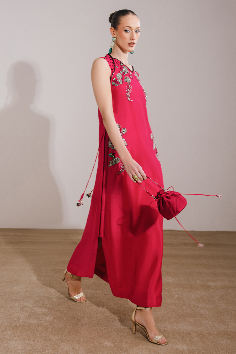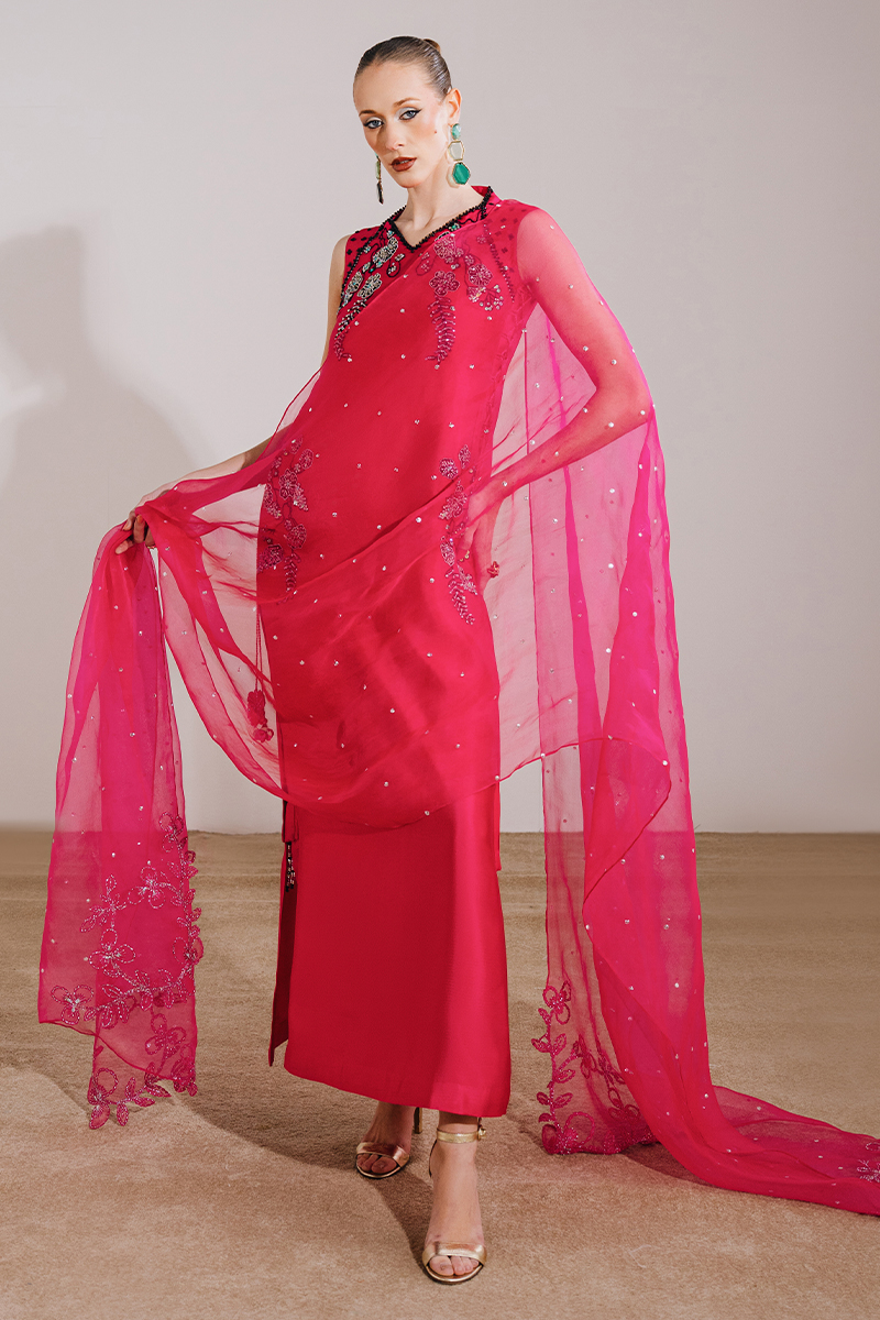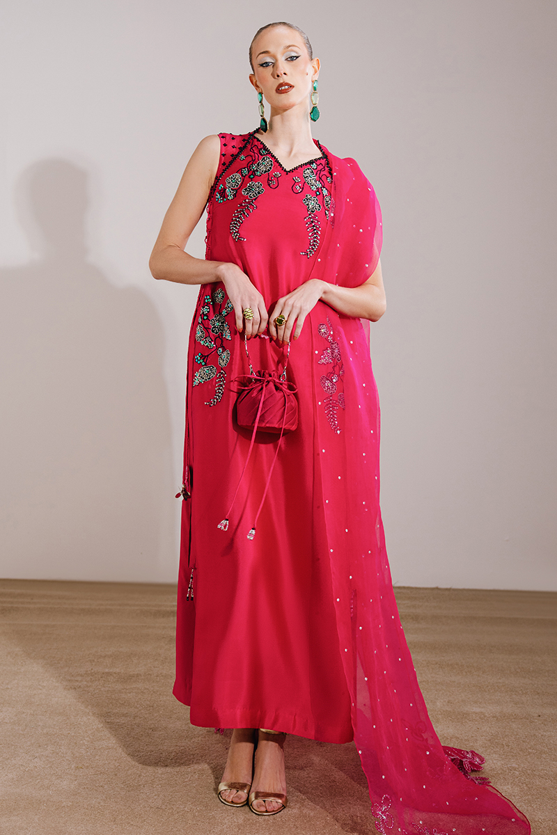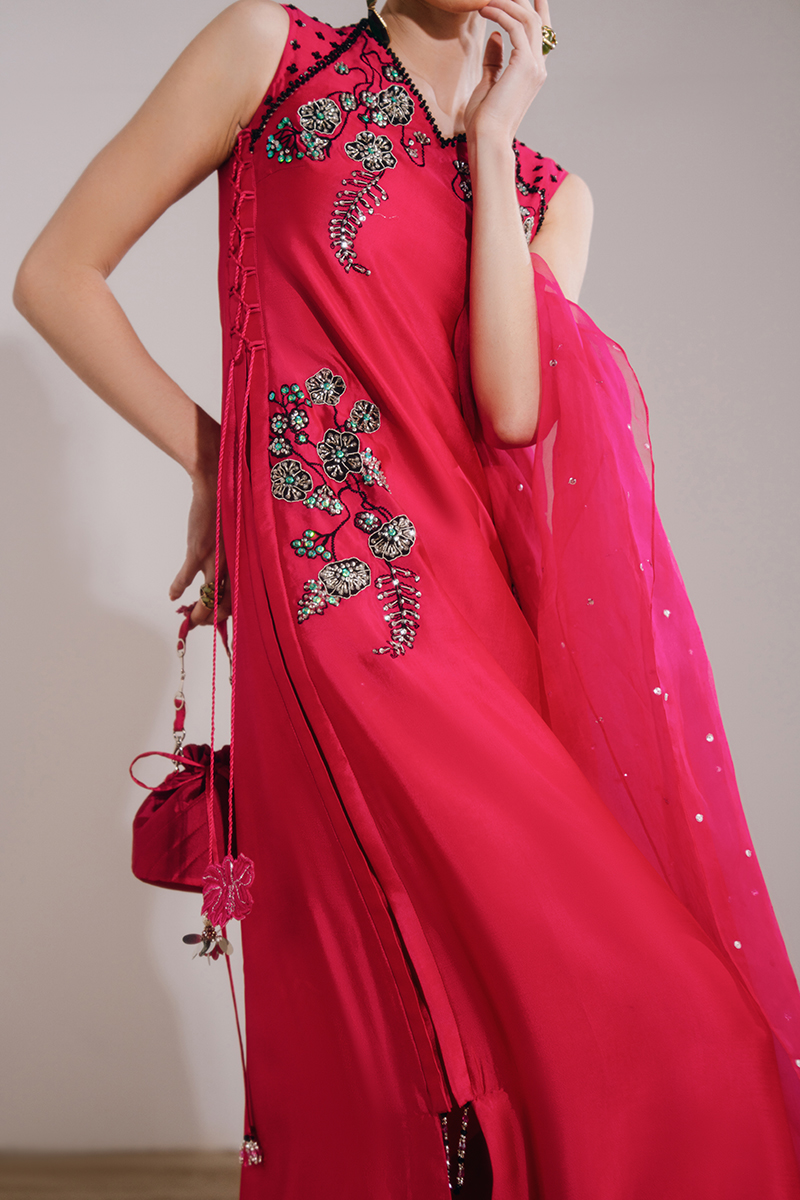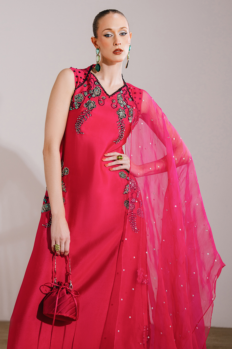 This shocking pink ensemble features a sleeveless kaftan-style dress paired with a sheer organza dupatta, creating a bold yet elegant statement. The dress is adorned with exquisite hand-embroidered and embellished florals, enhanced with crystals and sequins for a luminous finish, while tassel detailing adds a playful touch of movement. The look is completed with an organza dupatta, highlighted with embroidered corners and a delicate sequin spray, elevating the ensemble with festive charm.