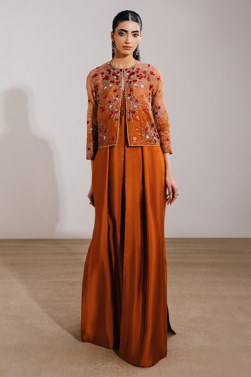 This burnt orange ensemble features a front-open short jacket paired with a layered dress and boot-cut pants for a modern, statement silhouette. The jacket is adorned with exquisite hand-embellished motifs and borders, complemented by meticulously embroidered sleeves for added detail. The underdress is designed with a sleeveless short bodice, attached with fluid panels and accentuated by waist-high slits that add movement and edge, while the boot-cut trousers complete the look with a refined, contemporary finish.