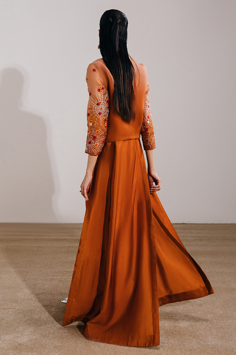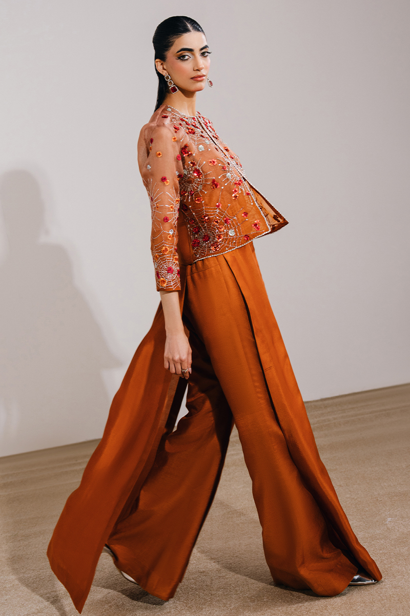 This burnt orange ensemble features a front-open short jacket paired with a layered dress and boot-cut pants for a modern, statement silhouette. The jacket is adorned with exquisite hand-embellished motifs and borders, complemented by meticulously embroidered sleeves for added detail. The underdress is designed with a sleeveless short bodice, attached with fluid panels and accentuated by waist-high slits that add movement and edge, while the boot-cut trousers complete the look with a refined, contemporary finish.
